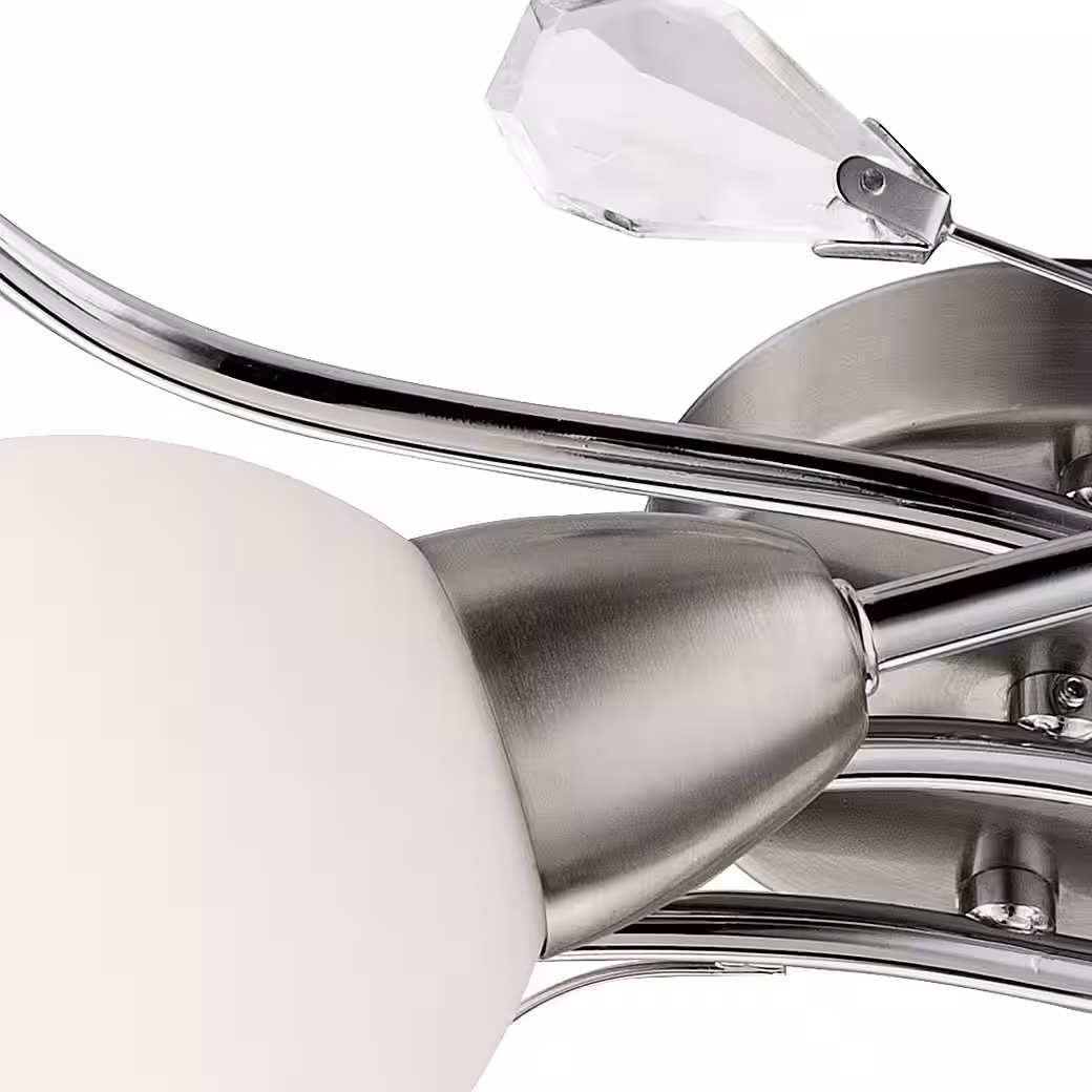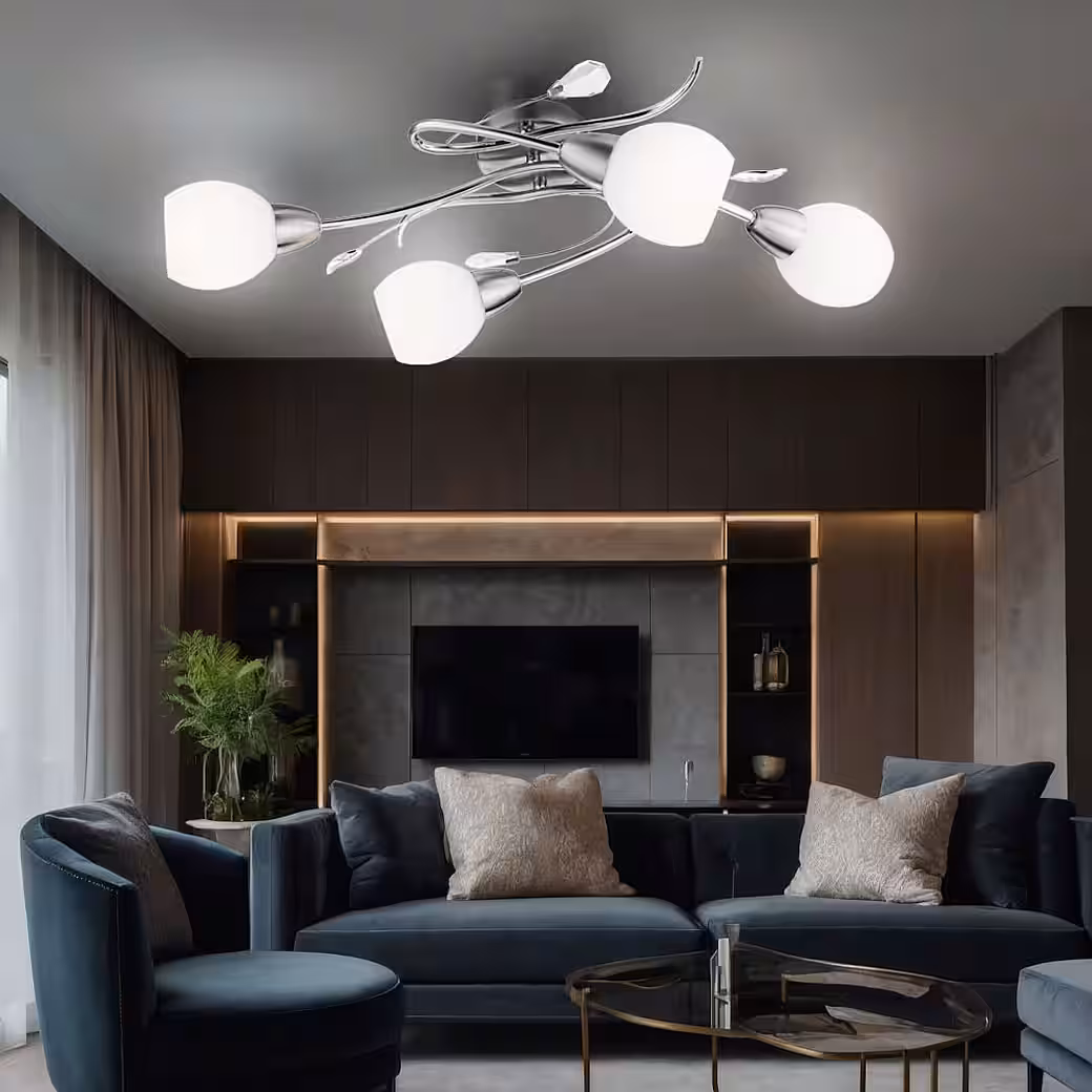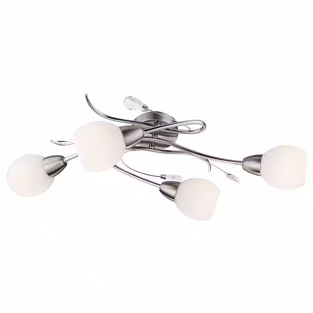 This elegant ceiling light with four spherical glass spotlights will beautifully accentuate your living space. The light is adorned all around with decorative glass leaves and features gracefully curved arms. This elegant design integrates seamlessly into any room.Â