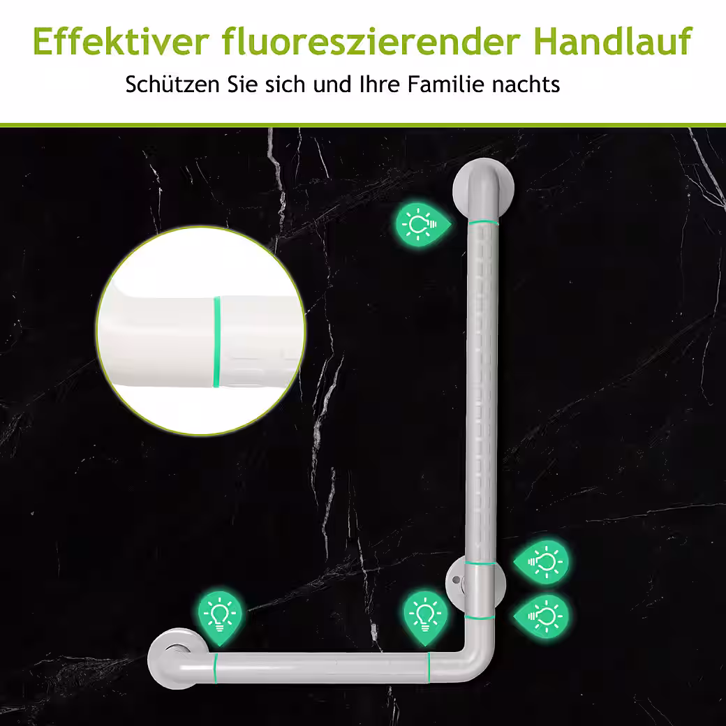 Non-slip and fluorescent: The L-shaped shower grab bar at a 90° angle is made of high-quality 304 stainless steel and non-slip nylon material. The raised contacts increase the friction effect, and the elegantly designed wall bracket ensures a clean look. The fluorescent ring design in the bathroom helps prevent the elderly, disabled, or children from falling and slipping in the dark and can provide support for users up to 200 kg.