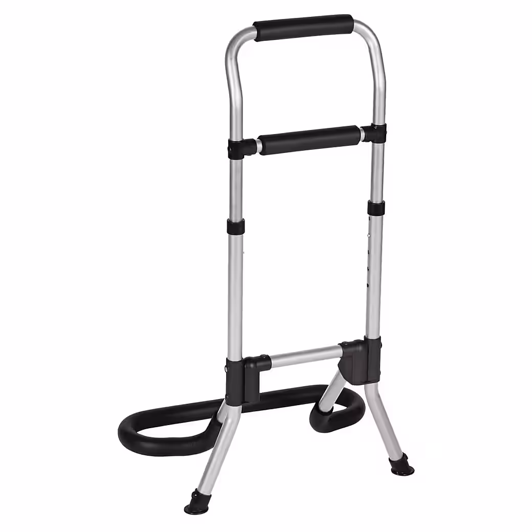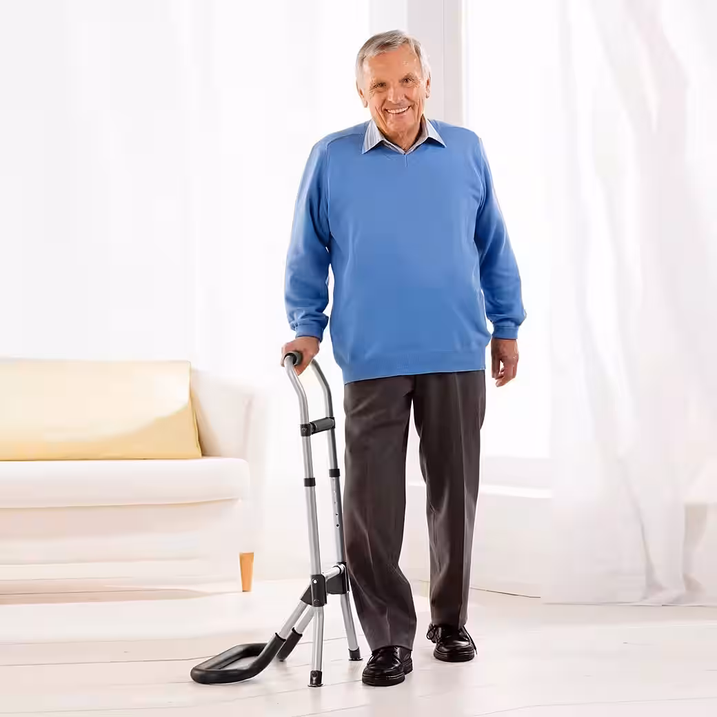 RFM – Mobile Standing Aid Mobility Rail and Standing Aid The RFM mobility rail supports people with limited mobility in their daily lives. The frame can be used both as a standing aid from bed or a chair and as a walking aid. Thanks to its lightweight and robust material and padded handle, it provides additional security while walking and can be used as support while standing, for short rests or for support. It folds easily for space-saving storage and transport. Features/Components: Walking aid, standing aid, and support rail in one. Foldable and easy to store. Padded handle. Height adjustable. Tool-free assembly. Color: Silver/Black. Technical Data: Made of aluminum. Handle height: 78-90 cm. Weight: 1.0 kg. Max. load capacity: 130 kg.