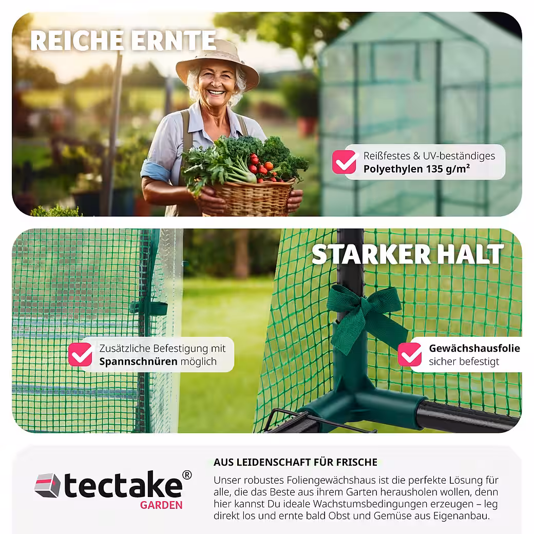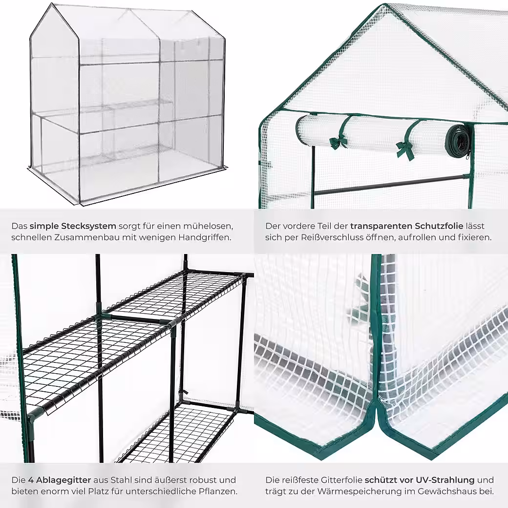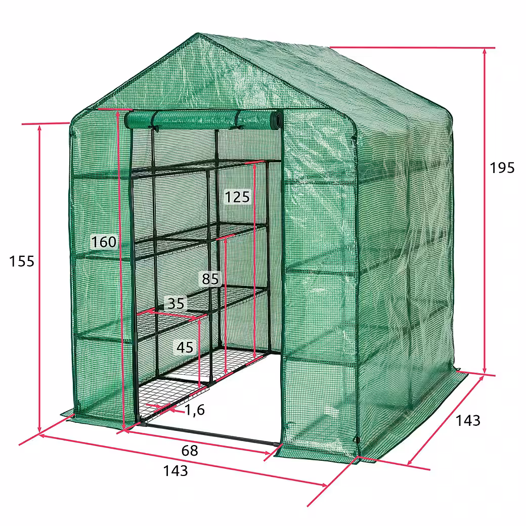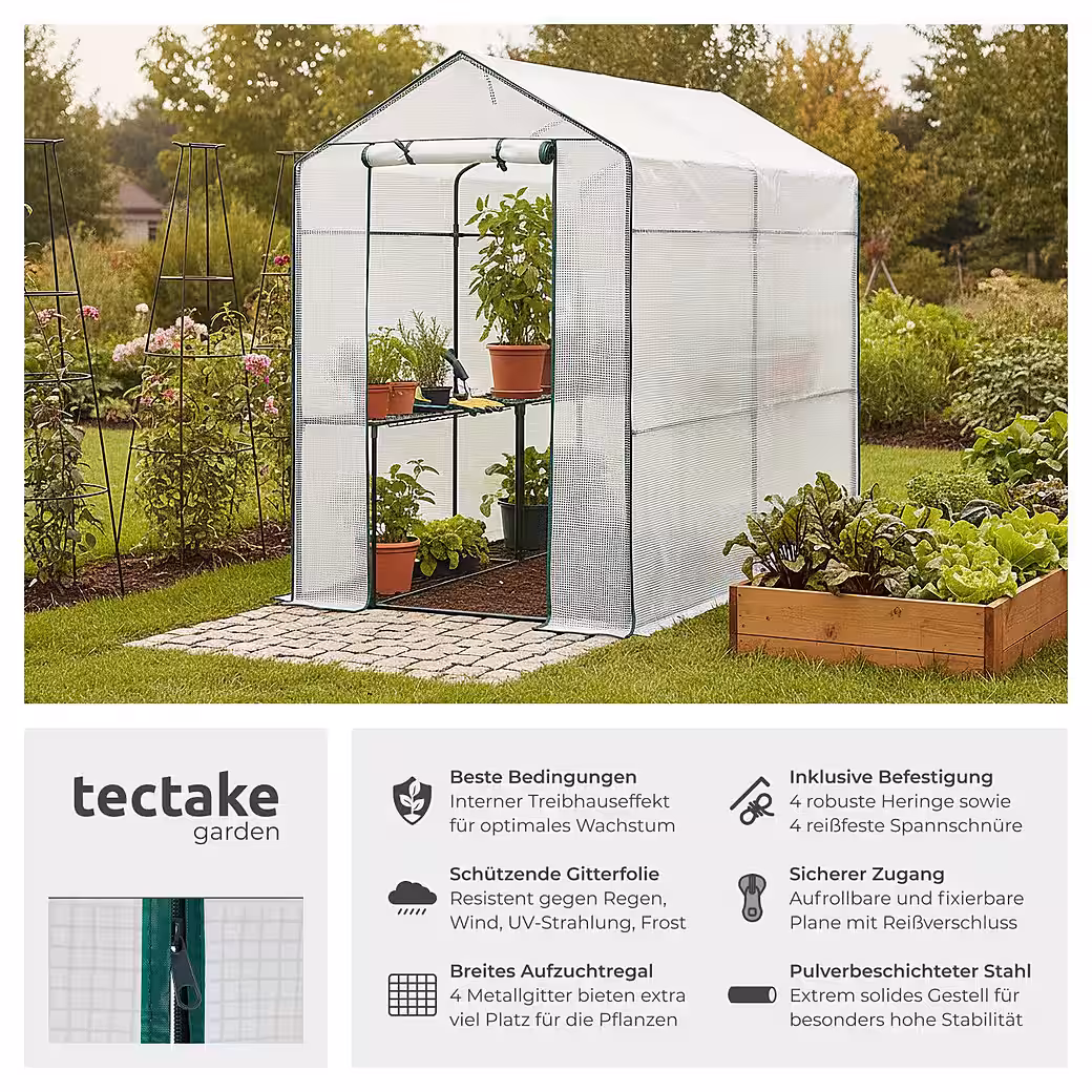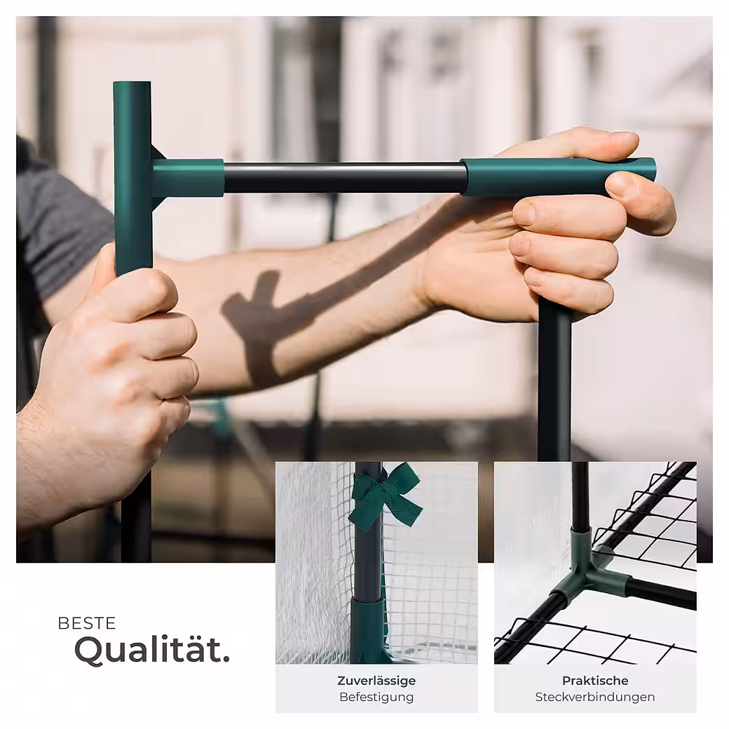 This practical greenhouse is ideal for growing plants in your vegetable garden. Simply grow your own vegetables, fruits, and herbs. Thanks to the increased warmth and humidity inside your own greenhouse, you can achieve excellent results when cultivating plants like tomatoes. Our garden greenhouse offers perfect protection from the elements, such as rain and excessive sunlight. The powder-coated steel frame is stable and robust. The durable cover is made of tear-resistant, UV-resistant PE material (polyethylene 135g/m²). It is resilient and protects plants from frost.Technical details