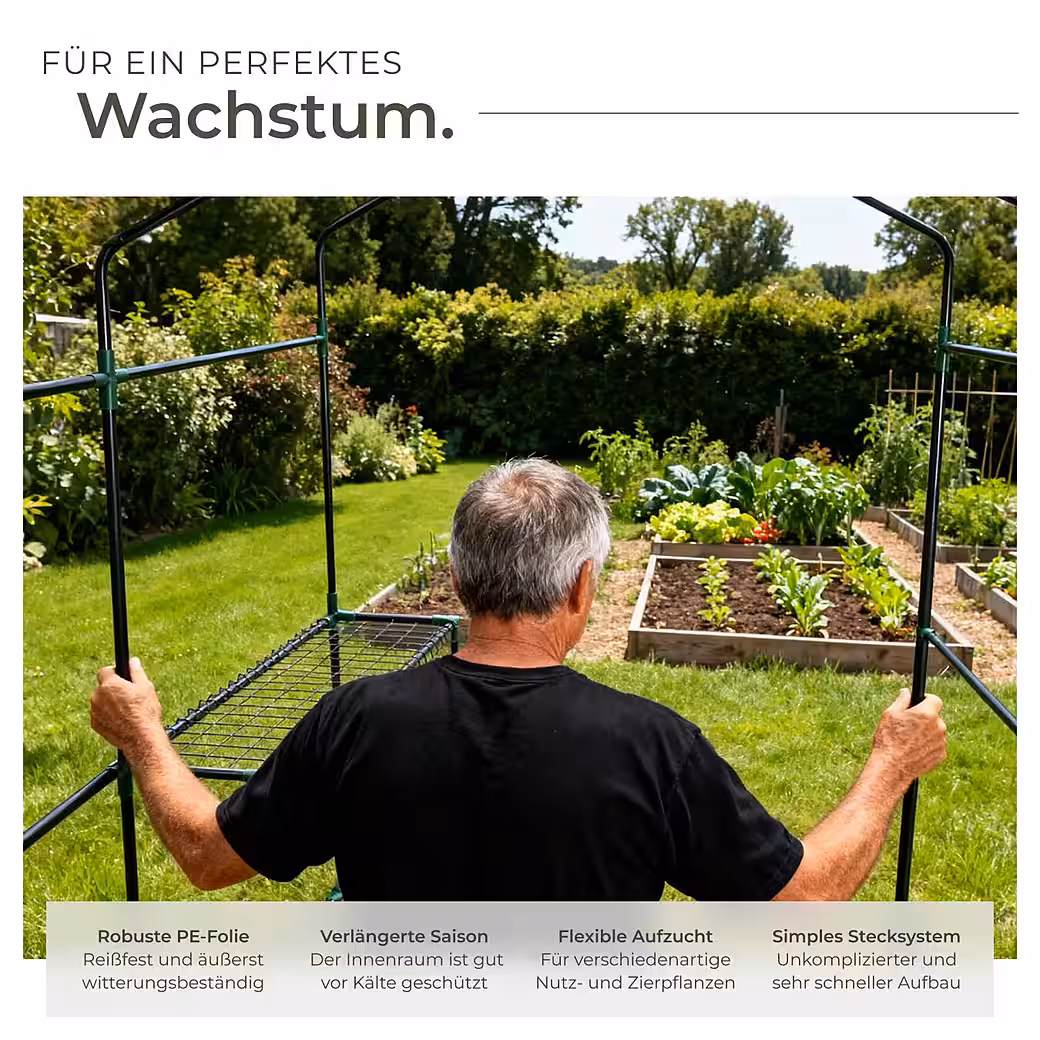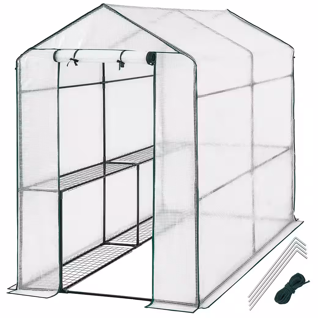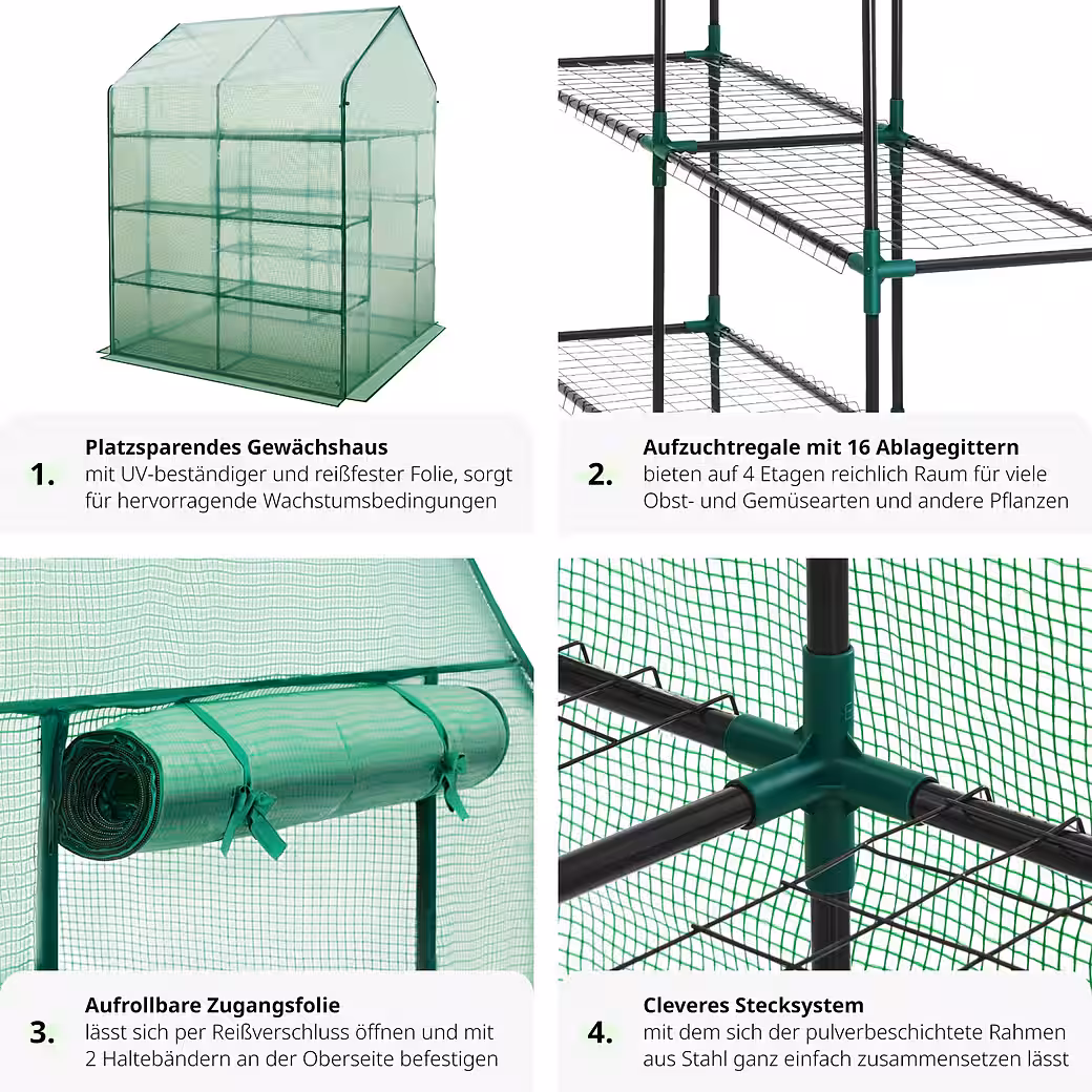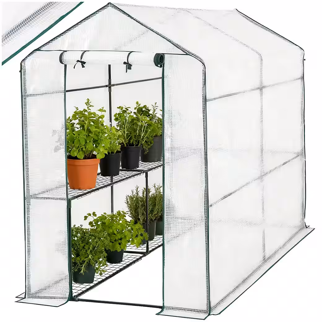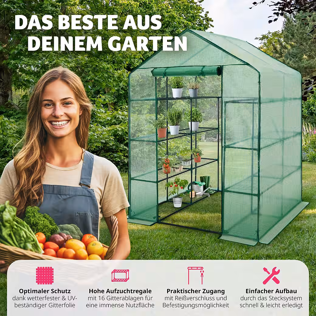 This practical greenhouse is ideal for growing plants in your vegetable garden. Simply grow your own vegetables, fruits, and herbs. Thanks to the increased warmth and humidity inside your own greenhouse, you can achieve excellent results when cultivating plants like tomatoes. Our garden greenhouse offers perfect protection from the elements, such as rain and excessive sunlight. The powder-coated steel frame is stable and robust. The durable cover is made of tear-resistant, UV-resistant PE material (polyethylene 135g/m²). It is resilient and protects plants from frost.Technical details