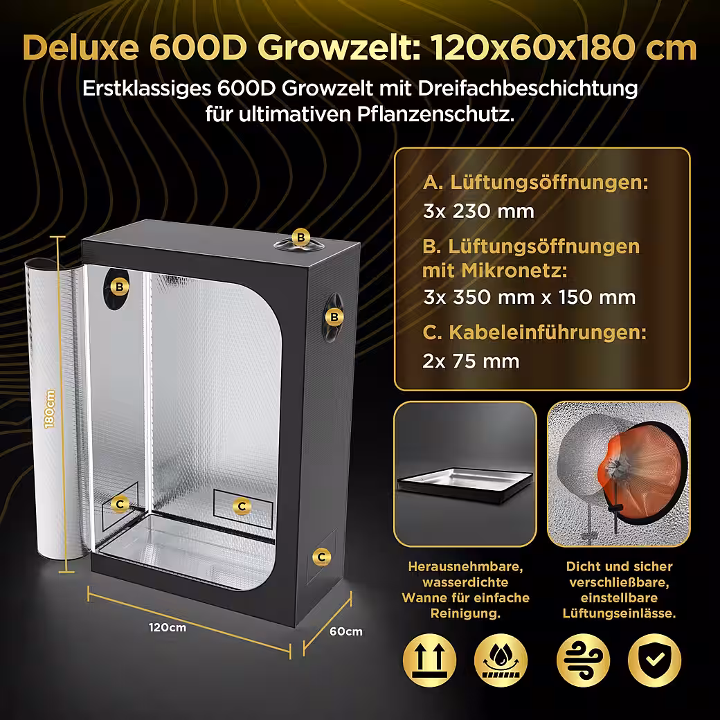 Dimensions (W x D x H): 120 x 80 x 180 cm, Complete set, 120 x 80 x 180, Samsung 240W LED, EC motor exhaust fan 683 m³/h, activated carbon filter 695 m³/h |