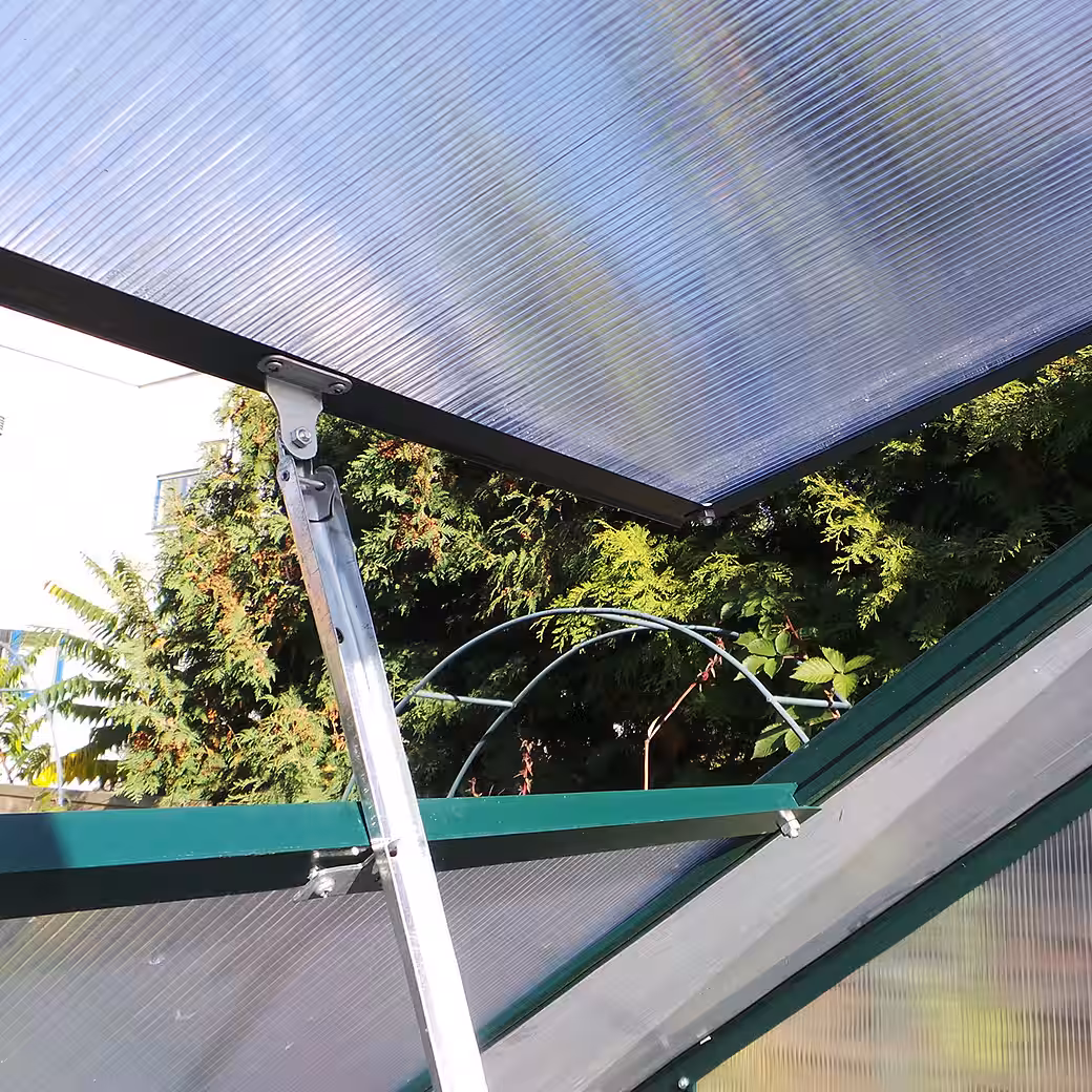 4.75 m² Volume: 7.68 m³ Base dimensions: 250 x 190 cm Ridge height: 205 cm Model : GH-775-6mm Dimensions LxWxH: 250x310x205 cm Floor area: 7.75 m² Volume: 11.58 m³ Base dimensions: 250 x 310 cm Ridge height: 205 cm GH-1075-6mm Dimensions (L x W x H): 250 x 430 x 205 cm Floor area: 10.75 m² Volume: 16.07 m³ Base dimensions: 250 x 430 cm Ridge height: 205 cm Frame: Anodized aluminum Foundation: Hot-dip galvanized steel Glazing: 6 mm twin-wall polycarbonate sheets – UV-resistant Additional details: – Rainwater drainage channel – Adjustable ventilation window – Impact and break resistant
