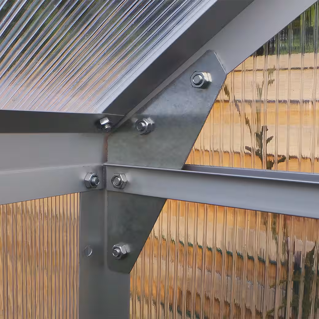 The greenhouse’s structural strength is reinforced by robust corner connectors and included diagonal braces. Furthermore, the UV-resistant polycarbonate sheets protect your plants from harmful sun rays. A foundation, included in the delivery, simplifies installation and further contributes to the greenhouse’s stability. Invest in a durable and practical solution for your garden that not only optimizes the cultivation of your plants but also provides protection and comfort all year round.