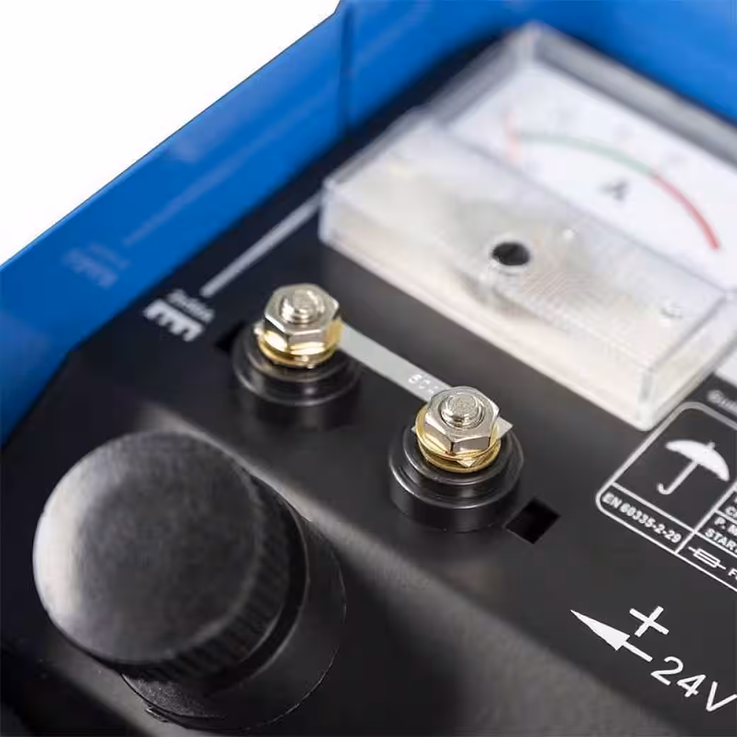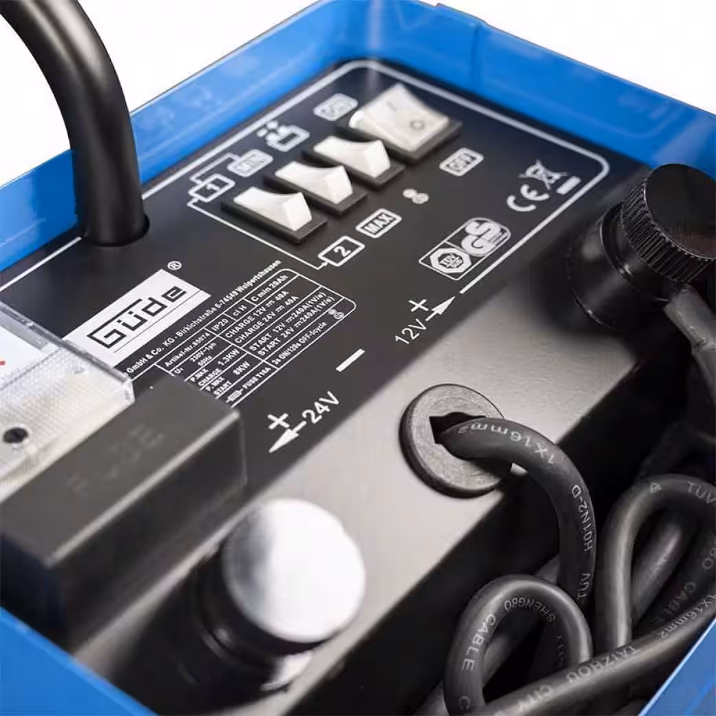 | The Güde V 421 C battery charger is suitable for jump-starting vehicles as well as charging and fast-charging 12V and 24V vehicle batteries with capacities from 20 to 800 Ah. It comes standard with a reliable and interference-free analog ammeter, a 2 m charging cable, reverse polarity and thermal protection , and fully insulated battery clamps. The package also includes 10 additional 50 A fuses. Weighing just under 16 kg, the device is easy to maneuver thanks to its large wheels, making it a perfect companion in any automotive workshop.