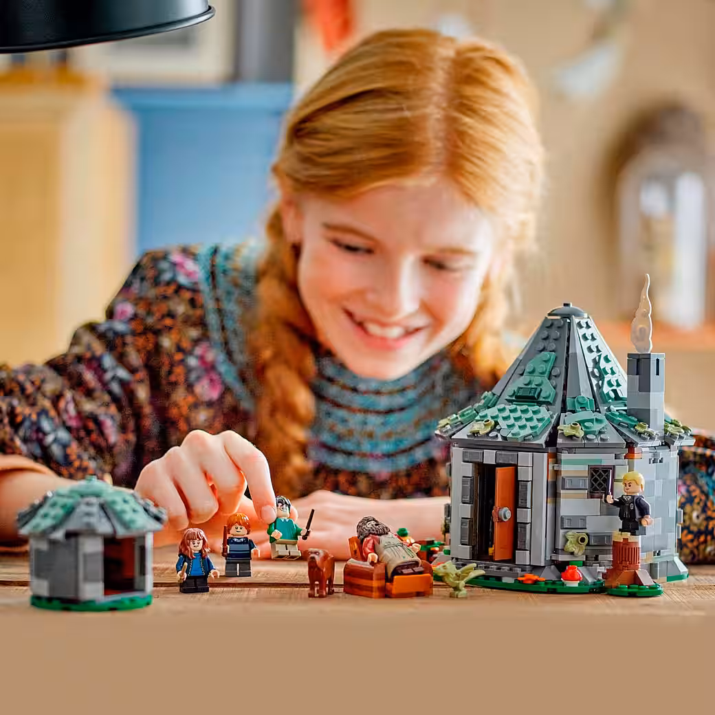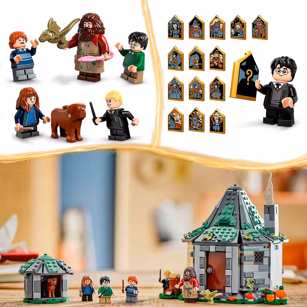With LEGO Harry Potter Hagrid’s Hut (76428), your child can recreate the unexpected visit of Harry Potter and his friends to Hagrid or experience other adventures in the Wizarding World. This LEGO Harry Potter toy includes a buildable model of Hagrid’s hut. The roof can be removed and the walls opened to reveal the detailed interior. Inside the hut, you’ll find a folding chair for Hagrid to sit in, a dragon egg, and two of the 14 possible Hogwarts portraits to collect. Outside, the buildable doghouse for Hagrid’s dog, Fang, offers additional creative play possibilities. This adventure toy represents an iconic location from the Harry Potter films and includes five Harry Potter character minifigures: Harry Potter, Hermione Granger, Ron Weasley, Draco Malfoy, and Rubeus Hagrid, plus the animal figures Norbert and Fang. Looking for the best Harry Potter gift for 8-year-olds, boys and girls? This Wizarding World toy lets children build and play independently or with friends. Hagrid’s hut is 17 cm high, 19 cm wide, and 15 cm deep. Contains 896 pieces.