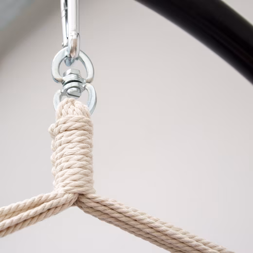The robust, 360° rotatable metal swivel guarantees comfortable and rotation-free sitting in the right direction. At the same time, you protect the suspension against excessive screwing. The assembly is done quickly: Simply screw a dowel and hook into the ceiling – you can of course also hang the hanging chair on a hammock chair frame or a sturdy branch in the garden.