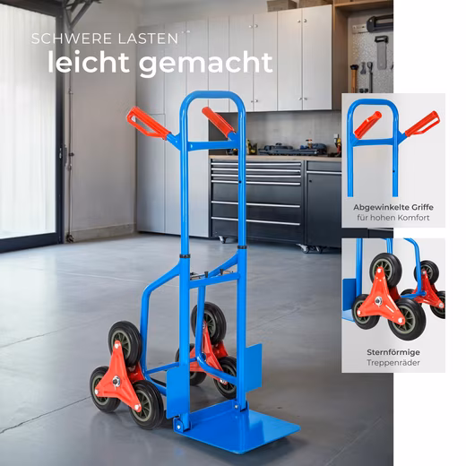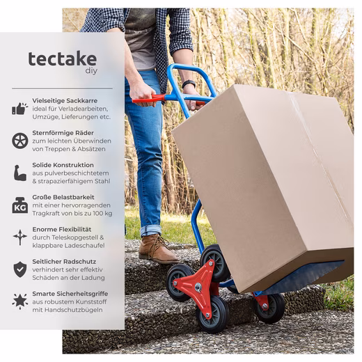 The high-quality and practical stair climbing hand truck from tectake belongs in your professional equipment. With a load capacity of up to 100 kg, it easily navigates stairs and curbs. Ideal for loading, deliveries, and removals, as well as for demanding DIY enthusiasts in the garden or around the house. Our hand trucks feature a robust tubular steel frame and sturdy plastic safety handles. The triple star-shaped wheels ensure exceptional stability. Get your top-of-the-line stair climbing hand truck from tectake today.Technical details