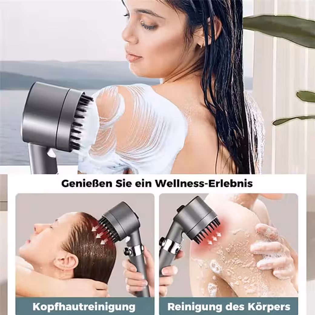 A practical one-button stop function allows you to briefly interrupt the water flow when needed, for example, when lathering up or washing your hair. The shower head also features an integrated silicone brush that provides gentle cleansing during showering and enhances the grooming experience – ideal for daily use as a handheld shower head.
