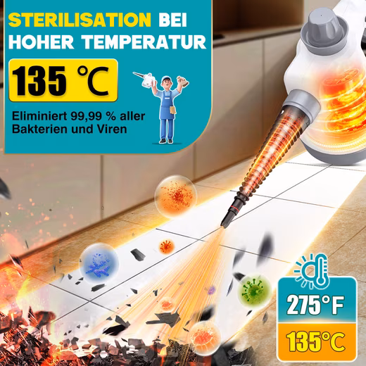 Powerful Superheated Steam – With 1050W of power, the steam cleaner heats up in just 3 minutes and produces hot steam at up to 135°C (275°F). The large 440ML water tank (recommended capacity 280ML) allows for 8-12 minutes of operation. Thanks to the high temperature, it effortlessly removes dirt, dust, grease and bacteria – without any chemicals.