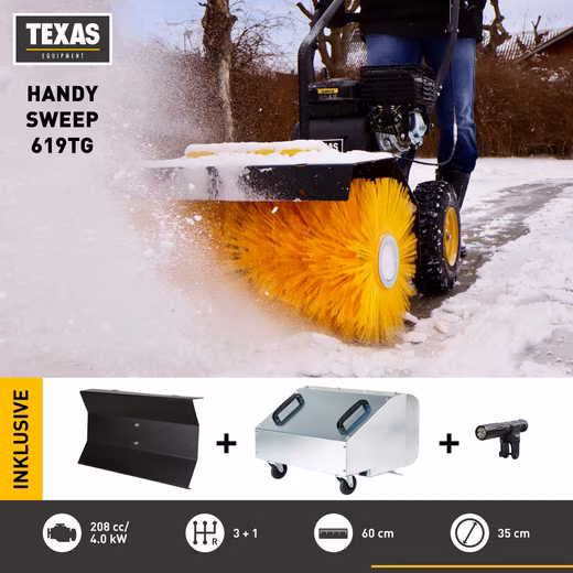 Handy Sweep for year-round cleaning. This complete package includes: – Handy Sweep sweeper – Collection basket – Scraper blade – LED light with bracket. This is a compact and efficient sweeper. The machine is equipped with a robust TEXAS 208 cc TG715S engine. It is ideal for large corner lots, sidewalks, and parking areas. The sweeper features a sturdy clutch lever that engages the drive (3 forward speeds + 1 reverse). The Handy Sweep 619TG has an ergonomic swivel handle that allows the brush to be rotated to the right or left. The brush pressure on the ground can be adjusted by adding or removing plastic shims above each support wheel. The machine has a working width of 60 cm and is equipped with durable, welded nylon brushes for increased longevity. The large snow tires provide good traction on slippery surfaces. The stiff brushes make it ideal for removing snow up to a depth of approximately 20 cm. In spring and autumn, the sweeper is also ideal for cleaning dirt, debris, leaves, and twigs along sidewalks, streets, and similar areas. The machine is delivered without engine oil! The Handy Sweep 619TG is exactly the same model as the Handy Sweep 640TG, but with additional accessories.