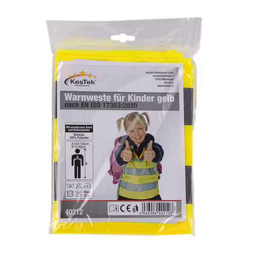 Original KesTek high-visibility vest for children in yellow, It is made according to EN ISO 17353: 2020 (AB3) and EN ISO 13688:2013 + A1:2021 and can be worn wherever high-visibility clothing is required. It is intended to make the wearer visible in bad weather and stand out from the surroundings. It increases visibility during the day (through the use of fluorescent material) and (through retro-reflective material) when using light in the dark. Places where a person should be clearly visible are highways, railways, school routes, etc.