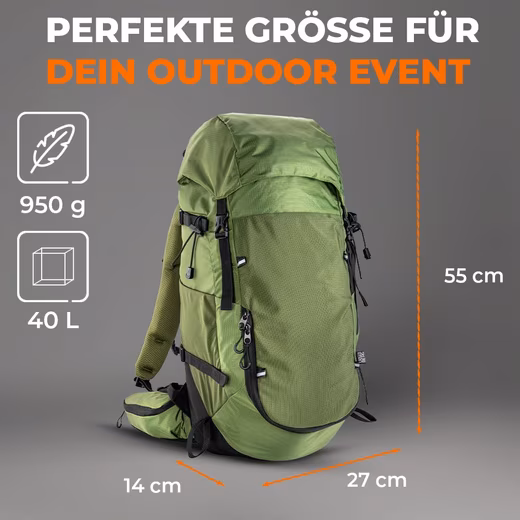 - STORAGE SPACE 40 L – Lots of space for equipment thanks to drawstring, stretch mesh bag & webbing for hiking poles.