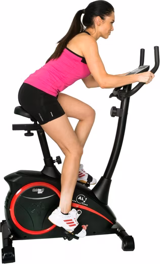 The stable AL 1 Black Edition exercise bike from Christopeit is equipped with a wear-free approx. 9 kg magnetic brake system and whisper-quiet flat belt drive to enable low-noise training with very good concentricity. The pedaling resistance is adjustable in 8 stages by means of resistance regulation, the computer has a holder for tablet and smartphone. The easy-to-use and large LCD display including tablet and smartphone mount allows easy reading of data and is easy to use with the buttons by simply touching them. The hand pulse sensors are integrated into the handlebars and can be used for pulse monitoring during training. The handlebars and saddle are tilt-adjustable and the saddle can be adjusted vertically in height and also horizontally using a quick-release fastener, so that a comfortable individual training position can be selected. The anti-slip pedals with the separate pedal safety band ensure a stable foot position when pedaling. The front transport rollers enable an easy change of location and the rear height-adjustable foot caps ensure a secure position of the device. Home sports training with the AL 1 means weather-independent, simple cycling training for physical exercise, as well as goal-oriented cardiovascular training or endurance training with pulse monitoring. This can result in a promotion of metabolism, a strengthening of the leg muscles and thus an improvement in the general fitness condition. The exercise bike also scores points with the possibility of entering personal limits such as time, distance and approx. calorie consumption.