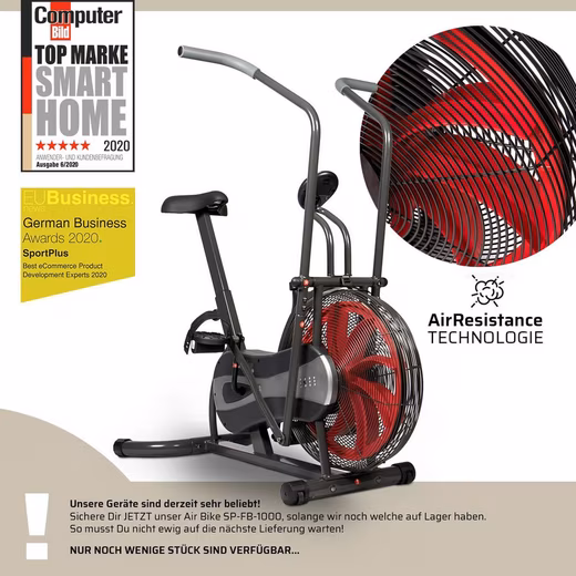 The innovative SportPlus Air Bike is not only a real eye-catcher visually, but is also characterized in terms of functionality and training effectiveness. Because in the small all-rounder, cross trainers and exercise bikes are in one, so that an effective cardio workout is possible with maximum training success and minimal time expenditure. The entire body is put under strain and, among other things, people die. Muscle groups and the cardiovascular system strengthened.