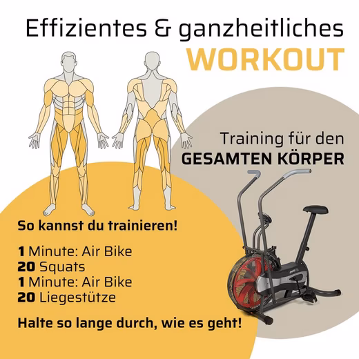 The workout on the air bike appeals to many muscle groups at the same time. In addition to the legs, the torso and upper body are also trained, which counteracts muscular imbalances.