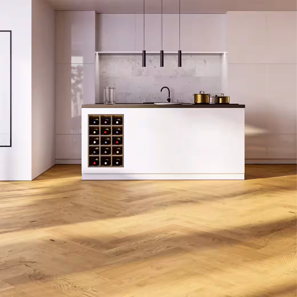 • Rustic design: Super matte oak in herringbone pattern, brushed and lacquered for a warm, authentic ambience.