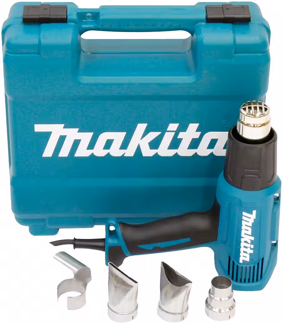 The Makita HG5030K hot air gun is a lightweight, versatile tool with 1,600 watts of power. The temperature can be switched between two settings, from 350°C to 500°C. It is ideal for removing stickers, drying, thawing, and removing old paint, applying edge banding, shrinking heat shrink tubing, disinfecting animal cages, lighting grills, and much more. The preset temperature is electronically maintained for particularly precise soldering and welding work. Overheating protection via a thermostat ensures the heating element automatically shuts off in case of overload. The motor of the HG5030K hot air gun is positioned perpendicular to the main airflow, thus protecting it from contamination. During breaks, the gun can be stood upright to cool down or hung up using the integrated eyelet in the handle.