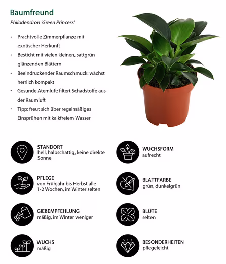To ensure your “Princess” thrives among your other houseplants, you need to do surprisingly little. Simply provide a bright location, but never in direct sunlight, at a comfortable room temperature . Your Philodendron ‘Green Princess’ needs regular watering, but be sure to avoid waterlogging. Regular misting with lime-free water will make it feel almost at home and encourage healthy, vigorous growth.