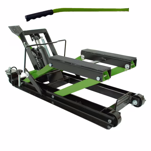 Motorcycle Lift 680 kg: A must-have for every mechanic and workshop! This motorcycle lift is suitable for any vehicle with low ground clearance, and is also ideal for lifting engines or transmissions. Two sturdy M12 bolts with convenient hand controls allow the lift to be raised to prevent rolling. Thanks to its compact design and two fixed and two swivel casters (60 mm diameter), this lift is perfect for mobile use. The foot pedal on the hydraulic pump allows for convenient, stepless lifting and lowering. The triple-position safety bars (preventing accidental lowering) allow the lift to also be used as a motorcycle stand, for example, to relieve the tires and suspension components of constant stress during winter. The lift comes pre-assembled, except for the included hydraulic cylinder, safety bars, foot pedal, and handle, and is ready for use in just a few minutes.