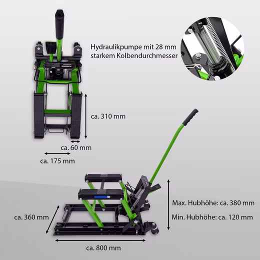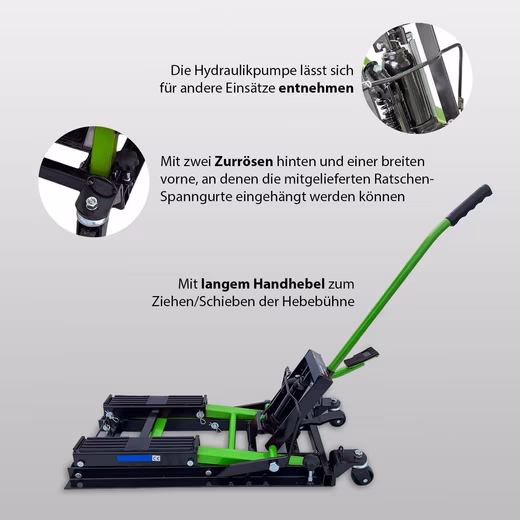 equipment With two lashing rings at the rear and one wide lashing ring at the front, to which the included ratchet straps can be attached. Two heavily rubberized and ribbed support surfaces on the two parallel lifting frames, each approx. 310 x 60 mm, 175 mm (inside) and 300 mm (outside) apart. Removable operating bar and foot pump lever. Hydraulic pump with a 28 mm piston diameter.