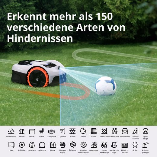 Detection of over 150 obstacles: The 140° camera detects more than 150 common garden objects.