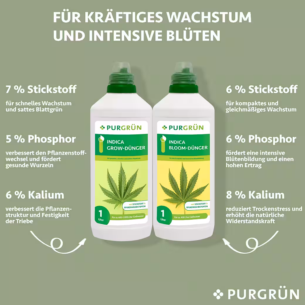 The fertilizer also supports the plants’ natural resilience, which is particularly beneficial under the often demanding conditions of indoor growing. With its balanced NPK ratio, tailored to the specific needs of Indica hybrids, Purgrün Indica Grow fertilizer promotes healthy leaf development and lays the foundation for potentially maximizing yield in the later flowering phase.