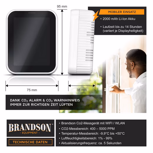- Monitor indoor air quality via WiFi: The Brandson CO2 meter measures CO2, temperature, and humidity. It alerts you via app and alarm. Ideal for relieving headaches and fatigue.