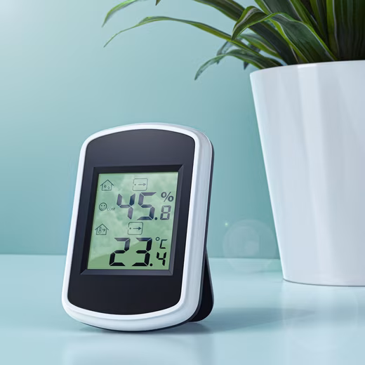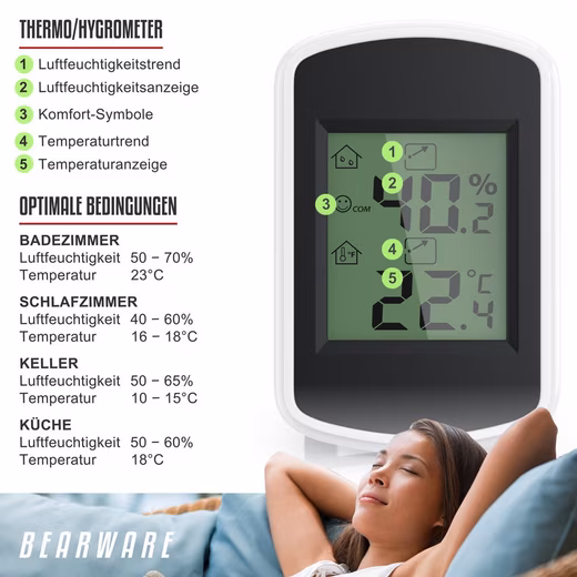 - Features: Temperature display, humidity indicator, comfort symbols, trend arrows