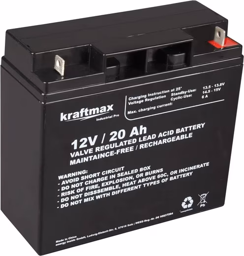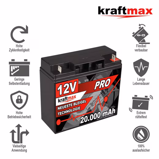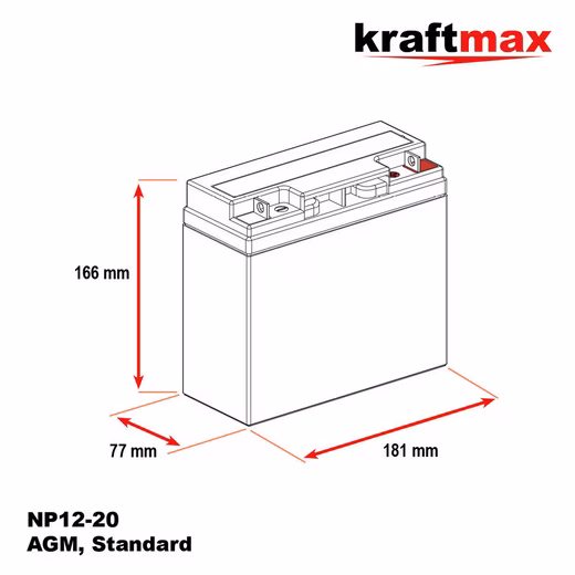 - Original Kraftmax 12V / 20Ah Industrial Pro high-performance AGM / VRLA lead-acid battery of the latest generation with bolt connection incl. screws | Dimensions: approx. 18×7.5×16.5cm