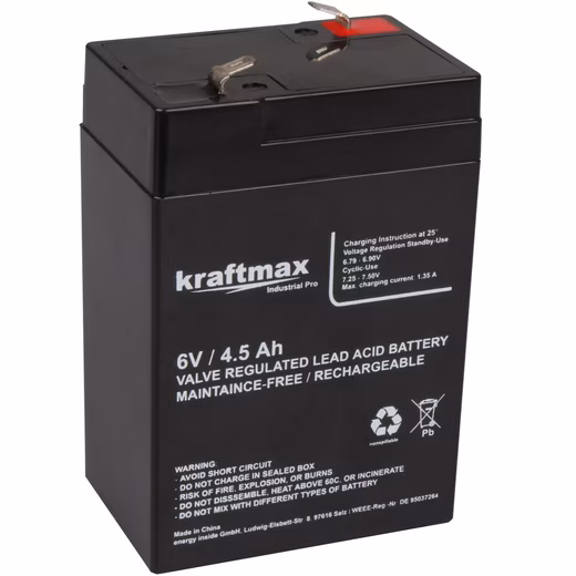 - Original Kraftmax 6V / 4.5Ah Industrial Pro high-performance AGM / VRLA lead-acid battery of the latest generation with Faston 4.8mm connection | Dimensions: approx. 6.8×4.6×10.1cm