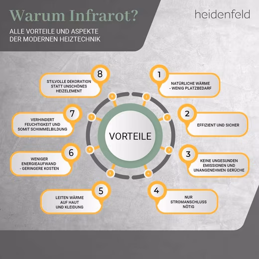 With infrared heating element. But why infrared for heating? Infrared radiation is also a component of the sun’s rays. That’s why the heat generated by the infrared heating element feels very natural. The heat is evenly transferred to the surfaces: This makes you perceive the temperature as particularly comfortable.