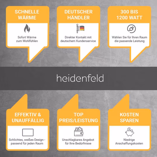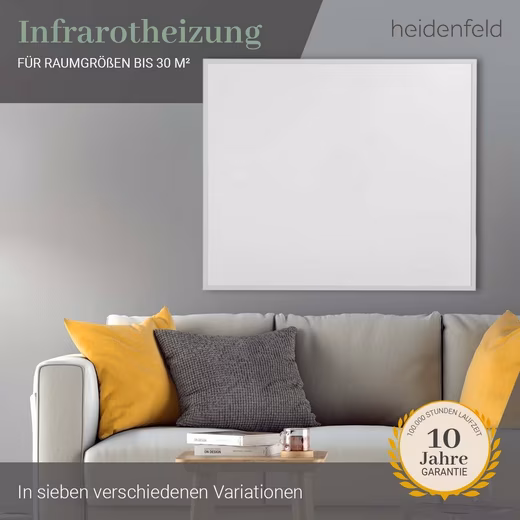 10-year warranty and 100,000-hour lifespan. With this high-quality heat wave heater you will also make yourself comfortable in the future! Because a long service life of over 100,000 hours distinguishes this heater with infrared. We are convinced of the quality. That’s why we give you a 10-year warranty on our Heidenfeld infrared heater HF-HP106-3 in addition to the legal warranty.