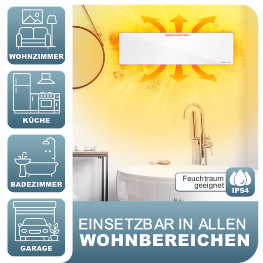Suitable for damp rooms and durable With protection class IP54, the device is protected against splashing water and is therefore ideal for use in damp rooms. The robust housing is rust-proof, easy to clean and weighs only 0.9 kg – making it easy to install, flexibly move and integrate inconspicuously into any room.