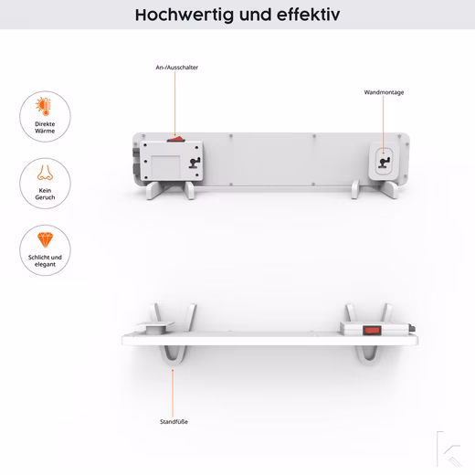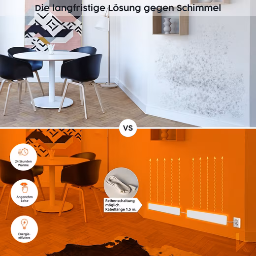 - Scope of delivery: 50W anti-mould heating, Euro plug, feet, mounting material – perfect for bathrooms, cellars and moisture-prone areas.