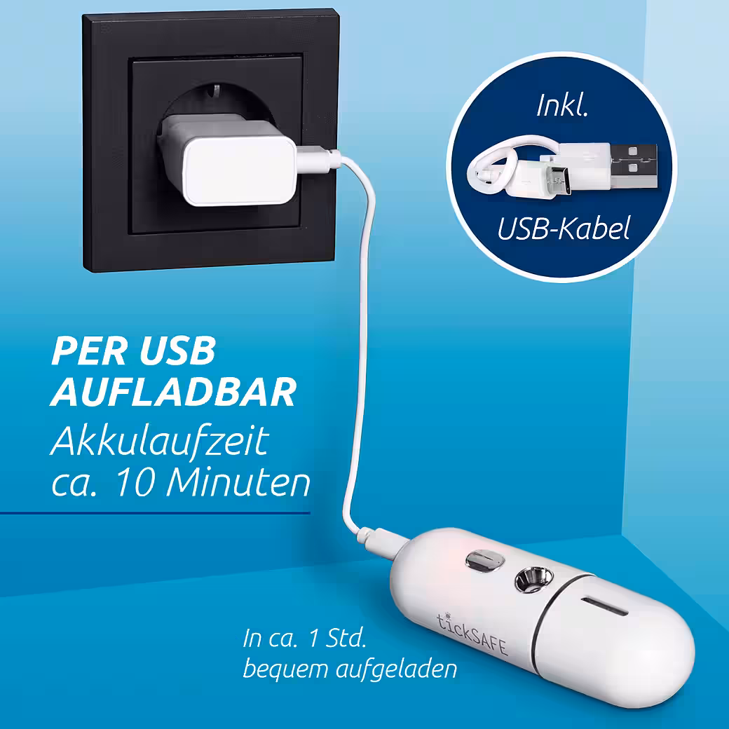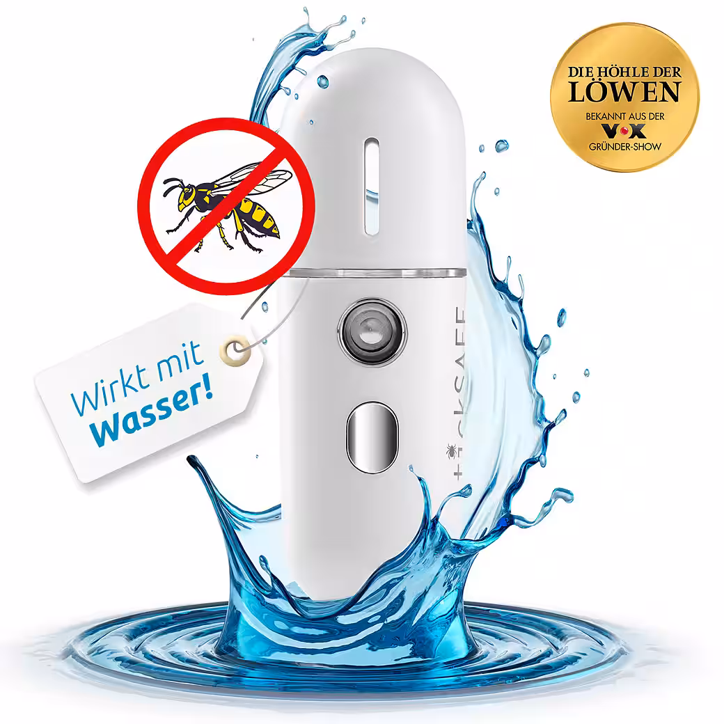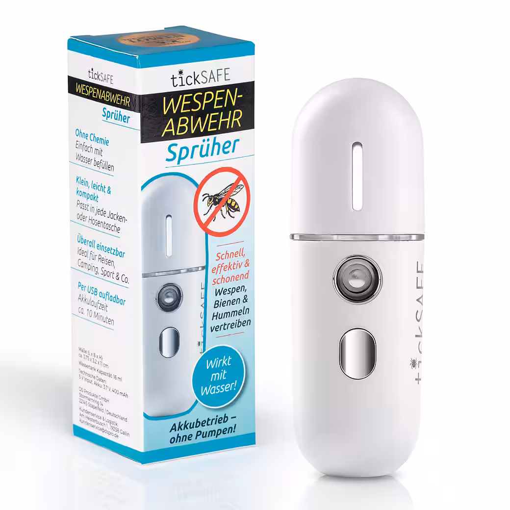 tickSAFE Wasp Repellent Sprayer – The gentle solution against unwanted flying guests. With the battery-operated tickSAFE wasp repellent sprayer, you can quickly and effectively repel wasps, bees, and bumblebees without any chemicals. At the touch of a button, the handy device produces a fine water mist – insects dislike this and quickly flee. Thanks to USB charging, no manual pumping is required. The battery charges in approximately 1 hour and lasts up to 10 minutes – including an automatic shut-off after 5 minutes to conserve battery power. Compact, lightweight (11 x 4 cm), and usable anywhere – ideal for travel, camping, picnics, or sports. With a 16 ml tank capacity, it’s your perfect companion for relaxing, buzz-free summer days.