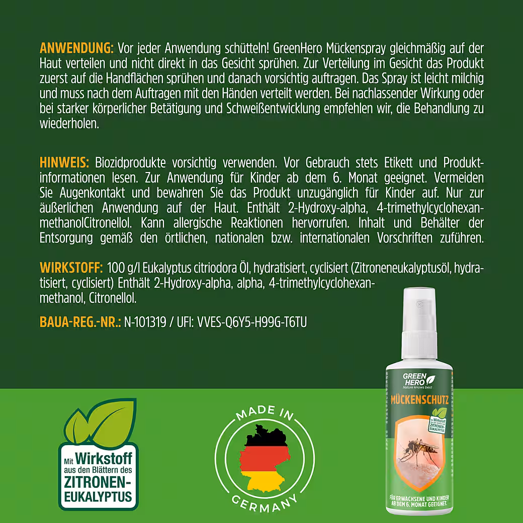 - MADE IN GERMANY: We produce our mosquito spray exclusively in Germany. We source our raw materials from selected producers in the region.