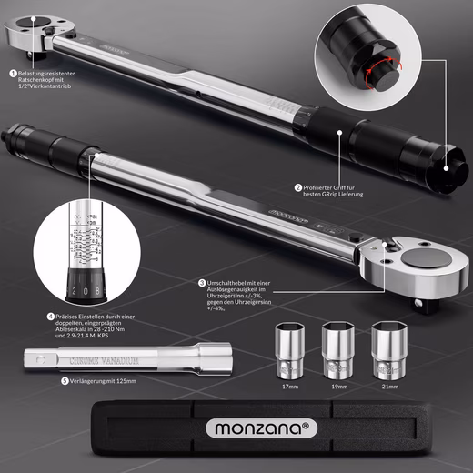 3 sockets (17, 19 & 21mm) made of high-quality chrome vanadium steel, an extension (125mm, chrome vanadium) and a sturdy transport box are included.