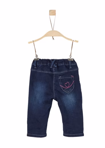 Especially warm and soft inside, light wash and seat crease effect, elasticated waistband with internal width adjustment, decorative darts below the waistband, faux pockets with small heart rivets at the front, one patch pocket with heart stitching at the back, comfortable fit with a slim leg, stretchy denim made from a cotton blend