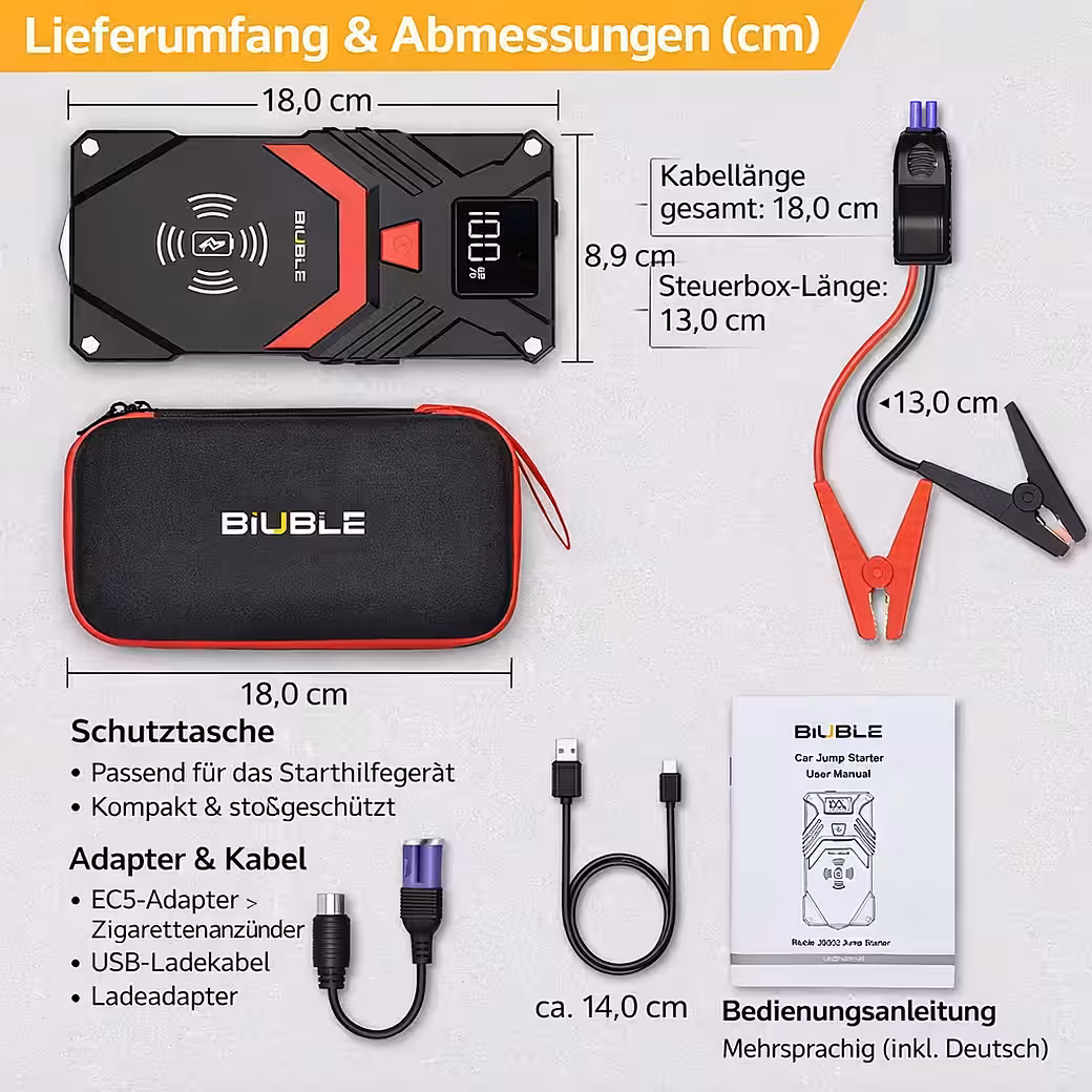 The ABS housing is designed for mobile use. Included in the package are 54 cm jumper cables, a carrying case, a charging/adapter cable, and an instruction manual.