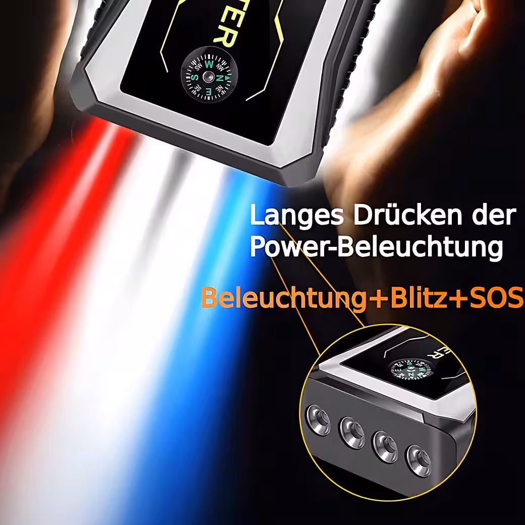The portable car battery jump starter has a built-in LED flashlight with 3 modes: flashlight, SOS, and strobe. The integrated glare system allows for use while camping, outdoors, in emergencies, while traveling, and more. Press and hold the button for 3 seconds to turn on the flashlight. Press twice to activate the SOS light mode.