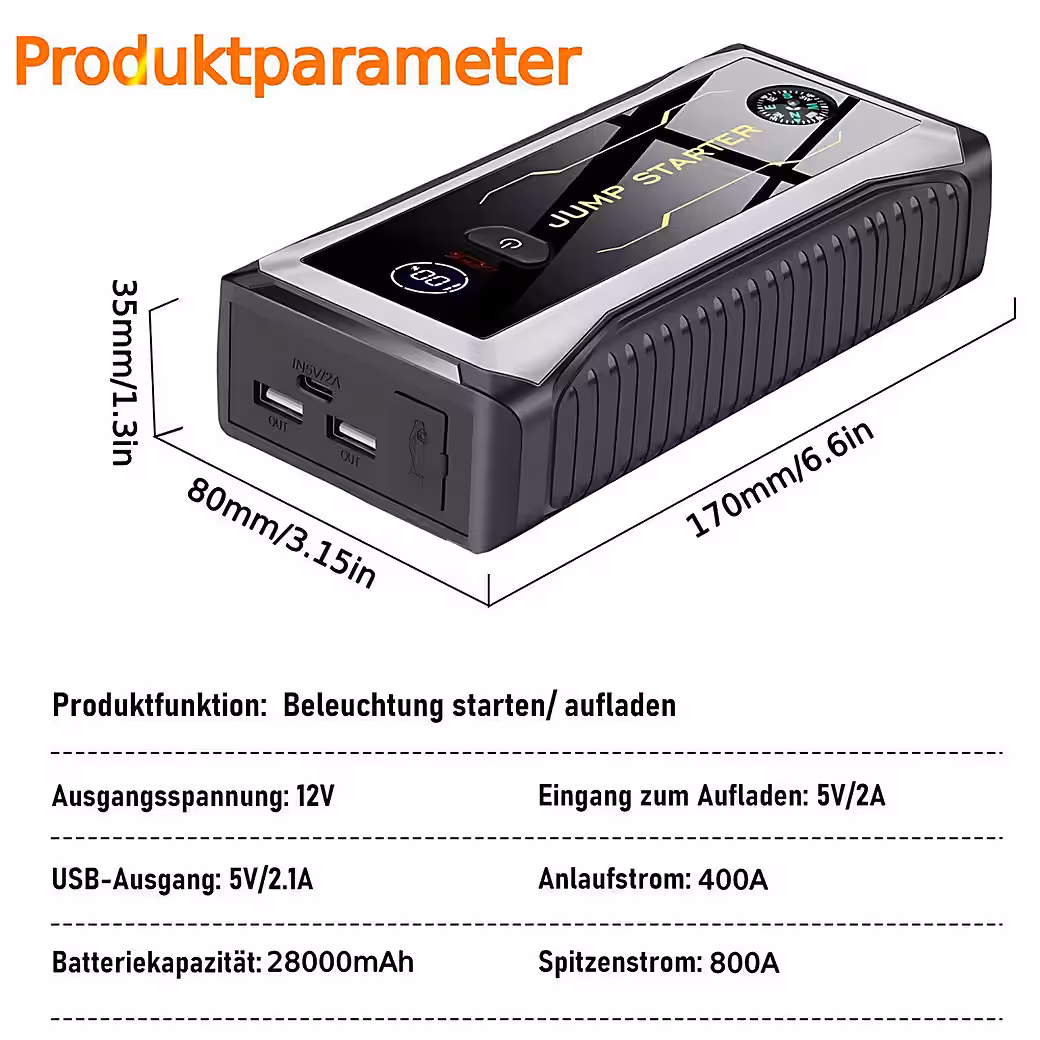 The unique design of this portable car emergency power supply allows you to easily and quickly jump-start your car in extreme environments (-20°C to +50°C). It features 8 built-in safety protection technologies (drop protection, high and low temperature protection, shock and impact protection, short circuit protection, impact/extrusion protection, overcharge protection, and over-discharge protection).