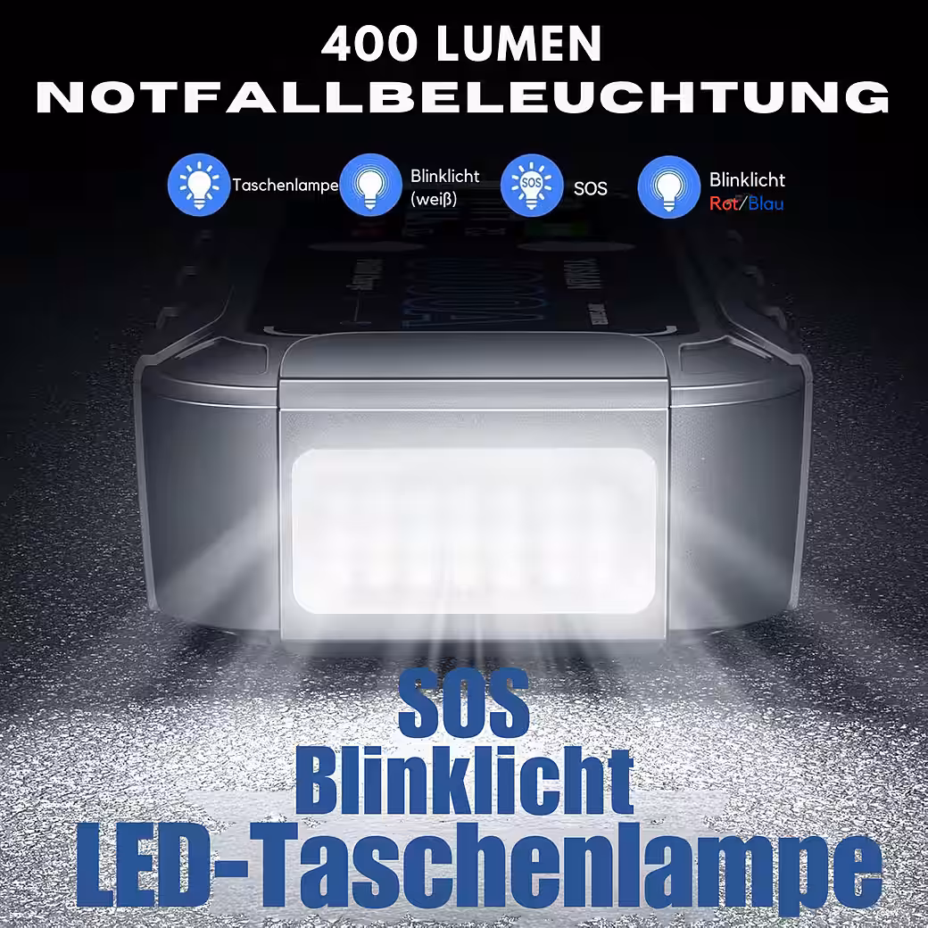 With a peak current of 6000 A, this high-performance jump starter starts almost any vehicle quickly and reliably – even with deeply discharged car batteries or in extreme weather conditions . The booster function provides particularly effective support during the starting process, making the device the ideal emergency aid for on the go.