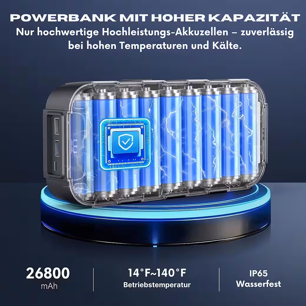 Besides jump-starting vehicles, the device also functions as a powerful 65W USB-C Power Delivery power bank . Thanks to bidirectional charging, the device recharges itself from 0% to 75% in approximately 60 minutes . Three output ports allow up to three devices to be charged simultaneously – ideal for laptops, smartphones, cameras , and more.
