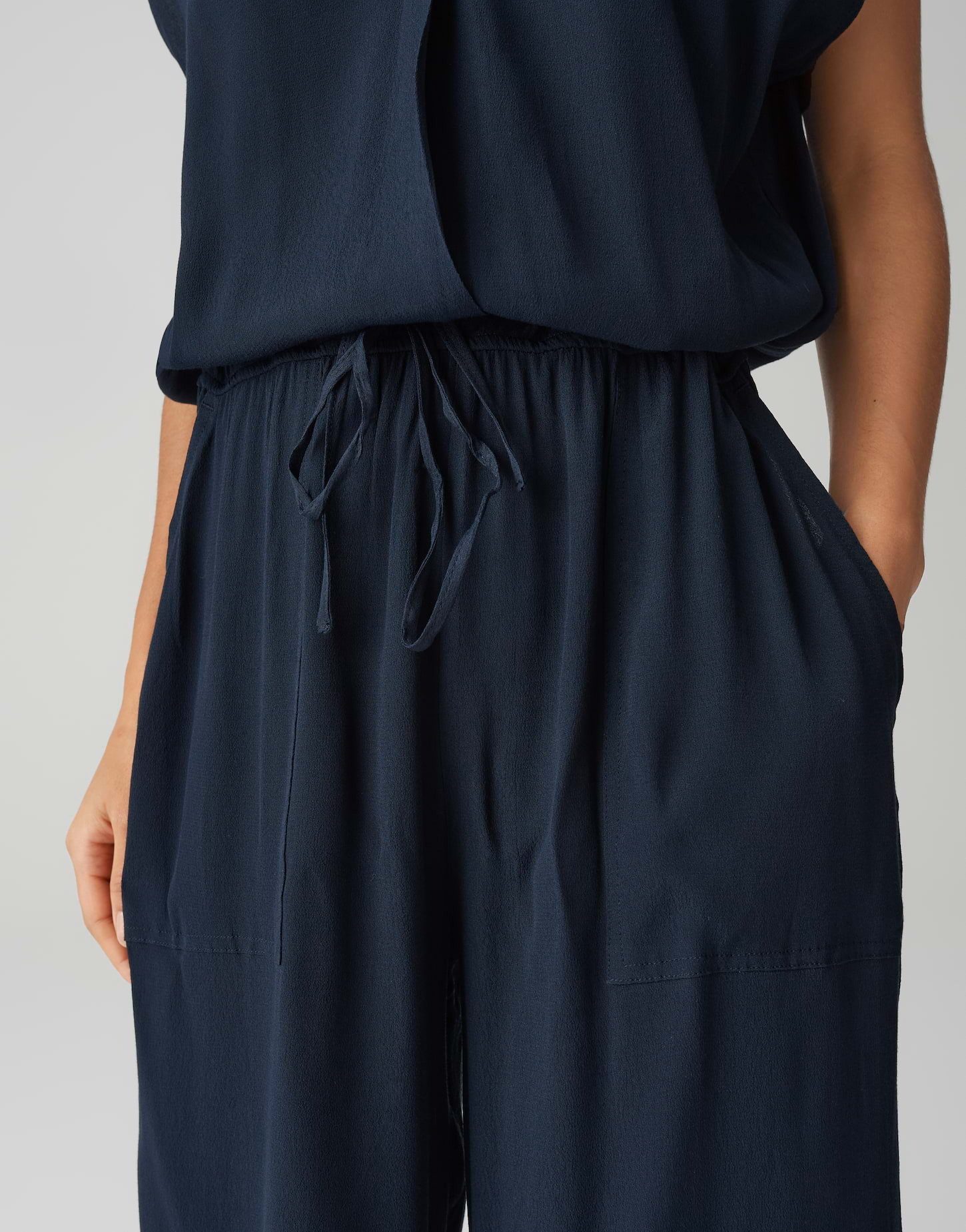 As a smart one-piece, this jumpsuit made of flowing crepe viscose brings effortless chic to everyday wear. A V-neck, wide leg, and comfortable waistband ensure a feminine shape and maximum comfort.
