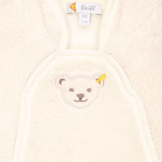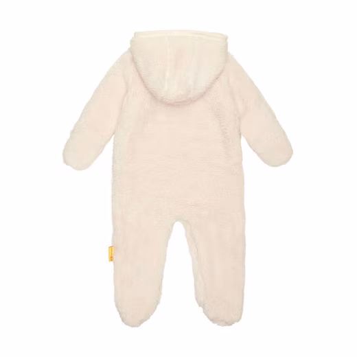 Comfortably warmed from head to toe, the plush, soft one-piece made of pink teddy fleece takes you on excursions and adventures. The large hood is equipped with soft jersey lining. Two parallel rows of press studs at the front up to the feet help when changing or changing diapers on the go. Flap cuffs on the sleeves serve as captive gloves if necessary. The fluffy Steiff teddy bear motif accompanies your little one as she discovers the world. To snuggle in!