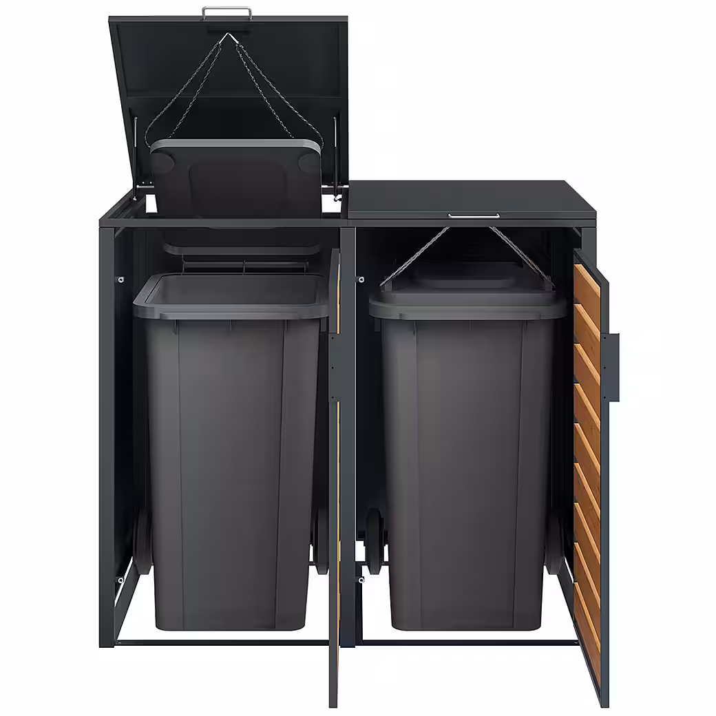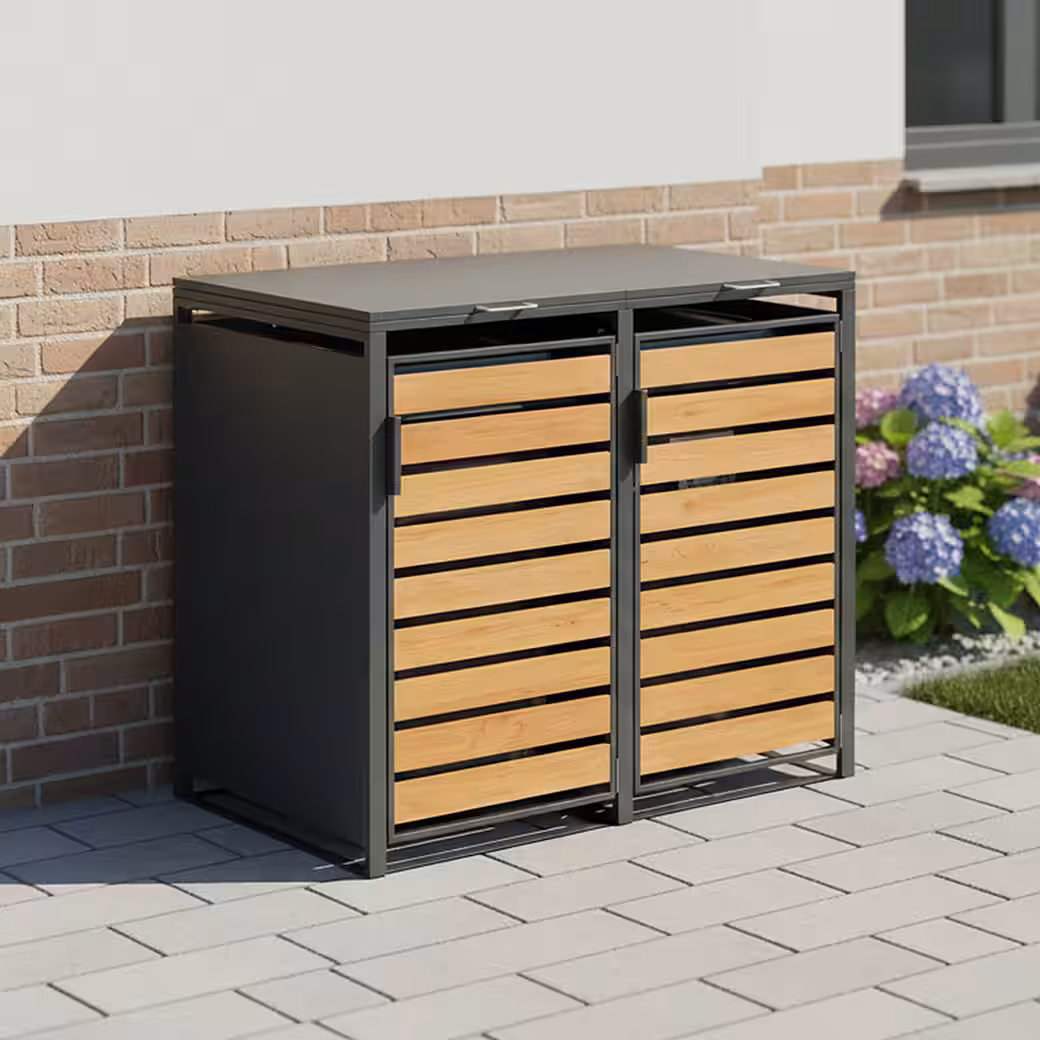 combines  stylish design with well-thought-out functionality: With its wood-look front and modern viewing strips, this bin enclosure offers an elegant way to store your bins – protected from the elements, animals, and unwanted glances.