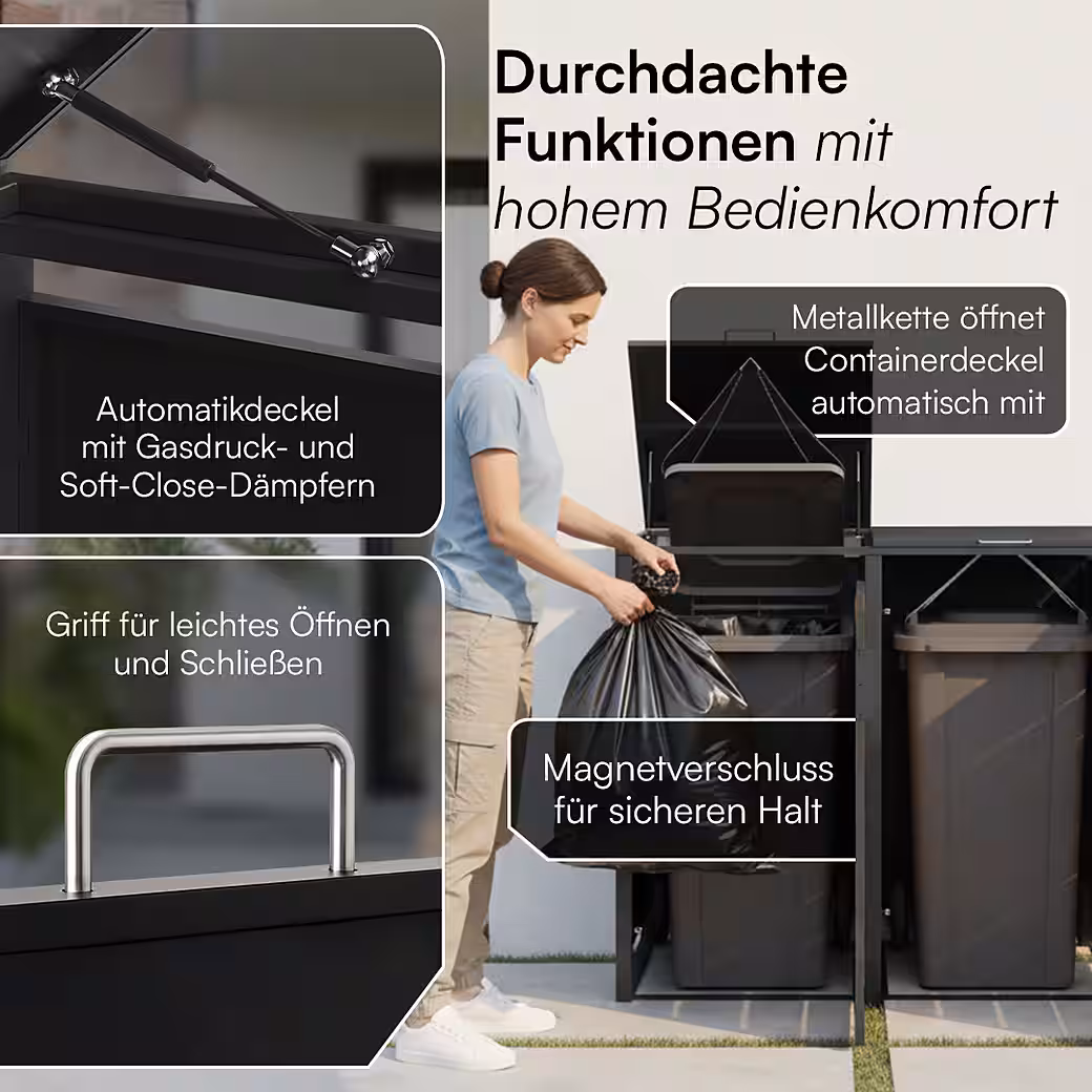 Thanks to gas springs and a soft-close mechanism, the lid opens effortlessly and quietly. The clever mechanism allows for simultaneous lifting of the lid and bin – for hygienic and convenient use.