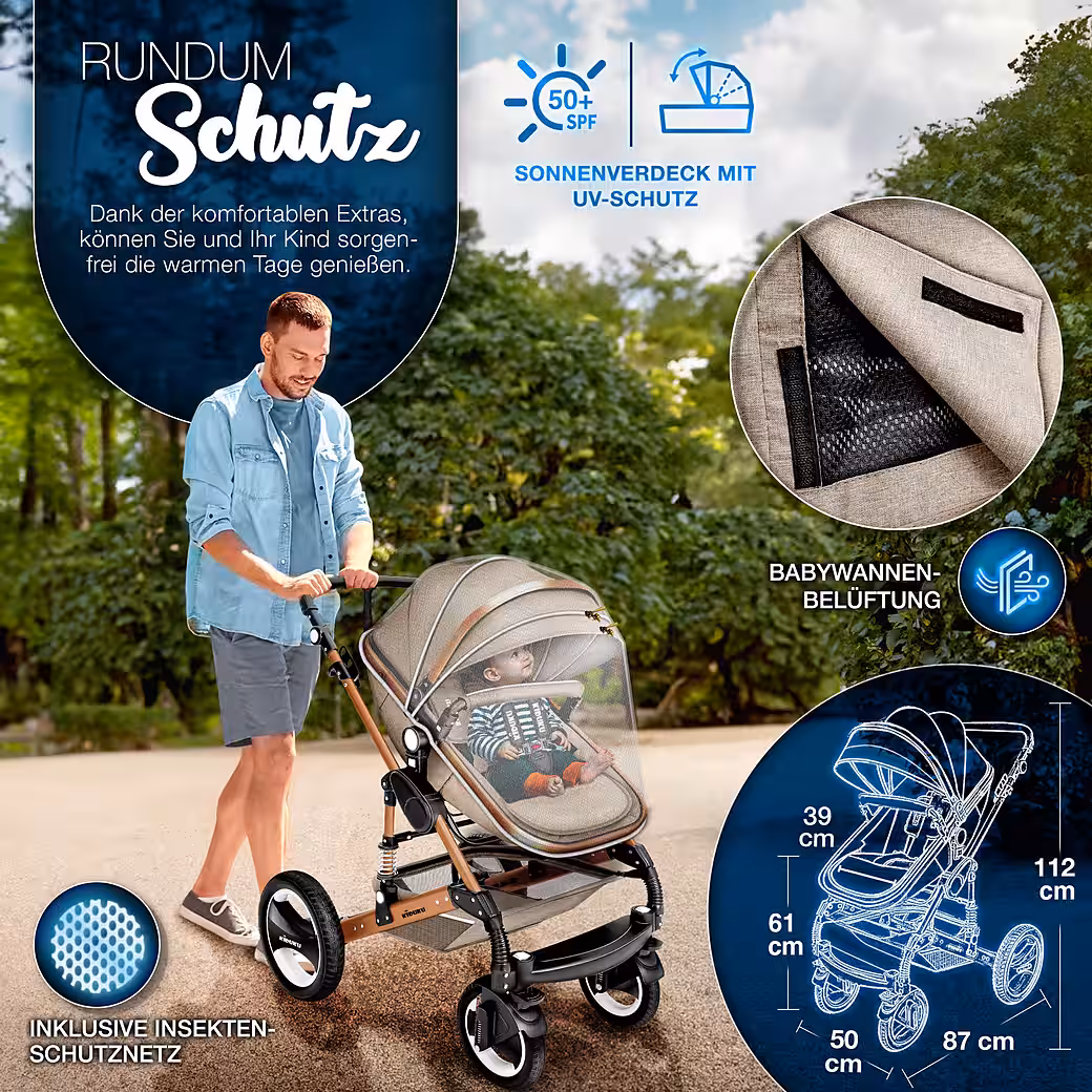 3-in-1 stroller/carrycot, buggy seat and infant car seat, solid rubber tires, 5-point safety harness, 4-position adjustable sun canopy with UV 50+ protection, removable safety bar, parking brake for secure hold, foldable carrycot, 360° swivel wheels, removable storage basket, removable protective cover, cup holder, back organizer, 4-point suspension, padded and adjustable backrest |