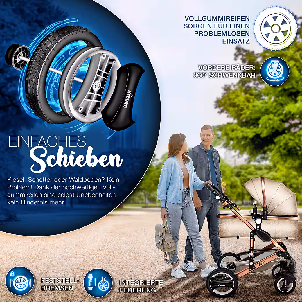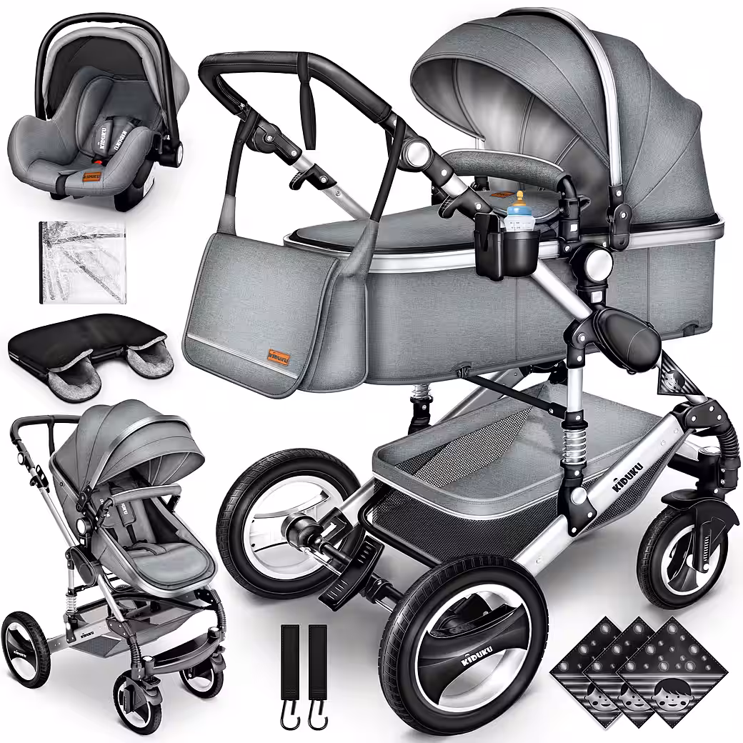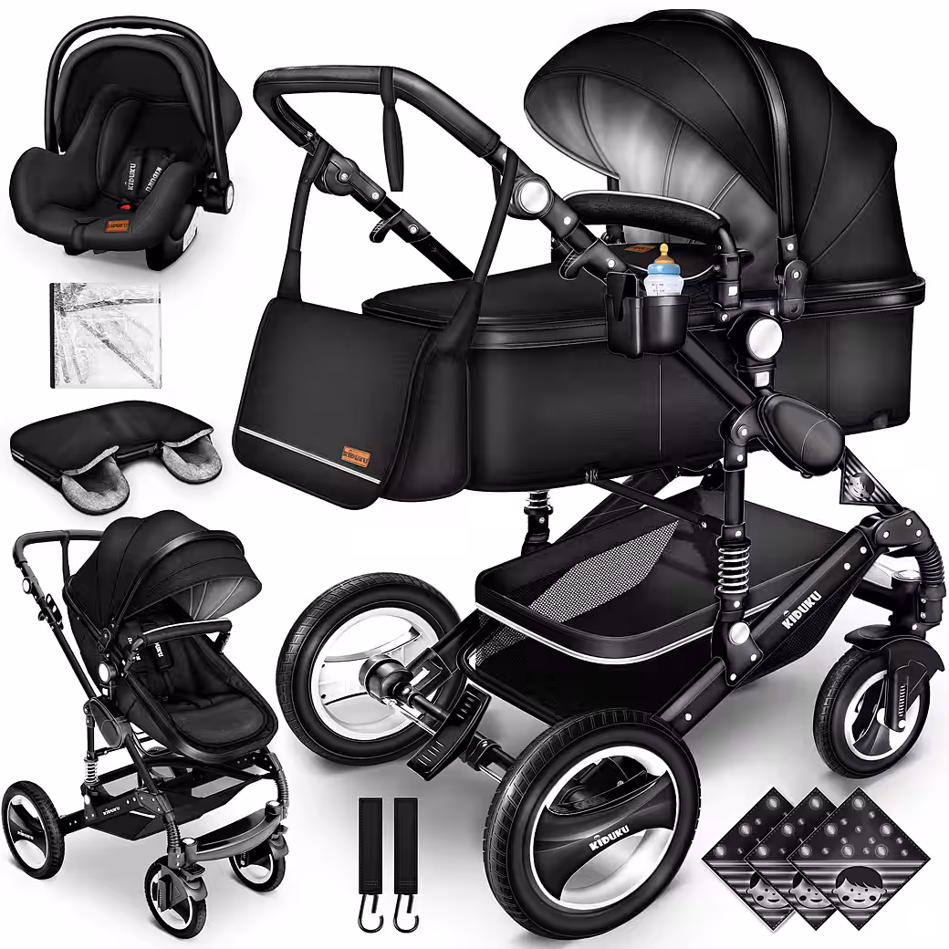 KIDUKUĀ® 3-in-1 XXL Stroller Complete Set | Combination Stroller Set incl. Bassinet, Buggy, Sport Seat & Car Seat, Footmuff | Solid Rubber Tires, Diaper Bag, Hand Warmer, Carrycot, Rain Cover, Toddler Tray